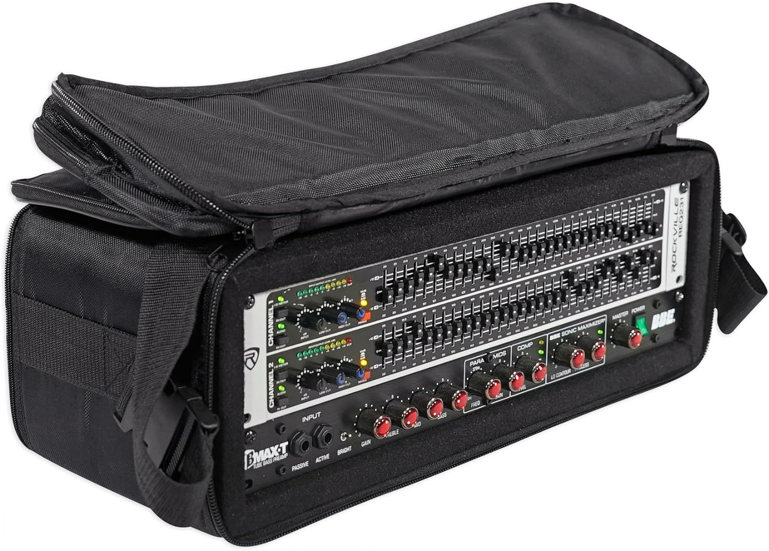 Rockville 3U rack / bag combo. These are excellent for when you need to transport your gear, and when the outer bag is removed they stack well too. Several heights and depths available.